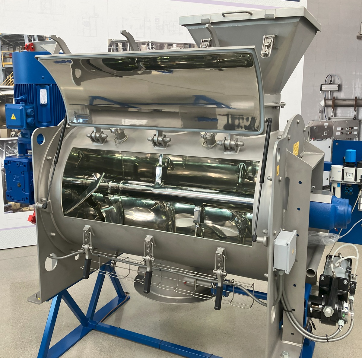 WAH Continuous Horizontal Single Shaft Mixers consist of a cylindrical mixing drum vessel with an inlet at one end of the mixing drum, an outlet at the opposite end and a venting spout, a full material mixing shaft, two drum closing end plates that carry flanged end bearing assemblies complete with integrated air or gas-purged shaft seals, and a drive unit complete with power transmission.